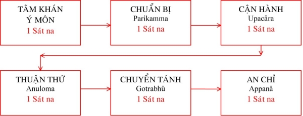 Lộ tŕnh của AN CHỈ TỐC HÀNH TÂM Tâm An chỉ (Appanā) ở đây giống như Tầm (Vitakka) nhưng nó sắc xảo và mănh liệt hơn. Thiền giă tự lựa chọn một đối tượng hợp với tâm tánh ḿnh, rồi chuyên chú quán tưởng đến khi chứng được Sơ Thiền. Lộ tŕnh tâm ở đây gồm: Tâm Khán Ư môn, Chuẩn bị, Cận hành, Thuận thứ, Chuyển tánh và An chỉ. 1) Tâm Chuẩn bị: gọi như vậy v́ tâm này xuất hiện để sửa soạn, chuẩn bị cho một tâm cao hơn; hoặc tâm Đáo đại, hoặc tâm Siêu thế. 2) Tâm Cận hành: gọi như vậy v́ tâm này khởi lên rất gần với Thiền tâm hay Siêu thế tâm sắp chứng được. Thông thường sau hai sát na của tâm này khởi lên là bắt đầu lộ tŕnh của An chỉ. Nhưng đối với người tu hành thuần thục th́ Cận hành tâm sẽ khởi lên mà không qua Chuẩn bị tâm. 3) Tâm Thuận thứ: gọi như vậy v́ tâm này vừa thuận với tâm trước và thuận với tâm kế tiếp. 4) Tâm Chuyển tánh: Nghĩa là tâm đă diệt trừ Dục giới tánh, phát triển Đáo đại tánh hoặc Siêu thế tánh. 5) Tâm An chỉ: Khi tâm này khởi lên là định tâm đă đạt được mức độ rất cao. Thiền (Jhāna) khi chưa phát triển đến mức tối đa được gọi là Cận định (Upacārasamādhi). Đối với người phàm phu hay hữu học (Sekha), một trong 4 tâm Thiện Dục giới Tịnh Hảo hợp Trí khởi lên. Đối với vị vô học (Asekha), th́ một trong bốn tâm Duy tác Dục giới Tịnh Hảo hợp Trí khởi lên. Lộ tŕnh của tâm An chỉ Siêu thế Đổng Tốc được diễn tiến như sau: